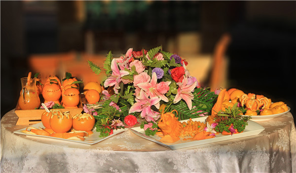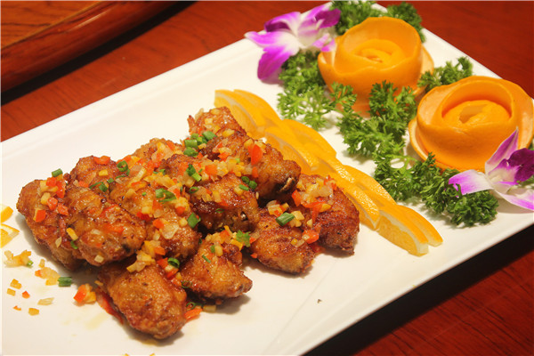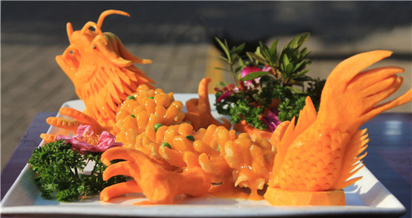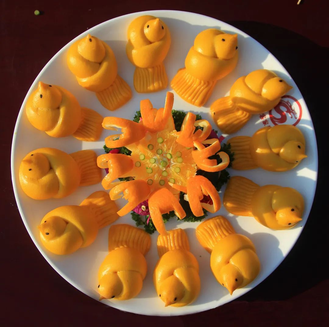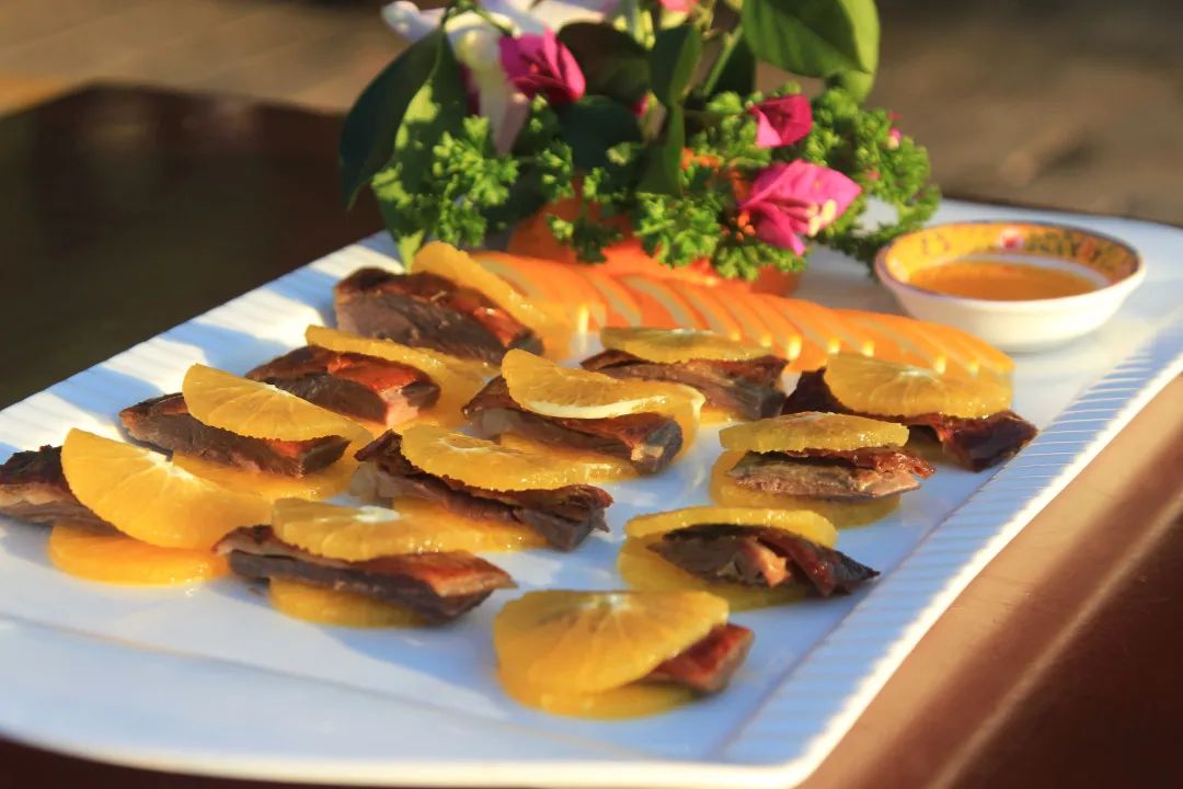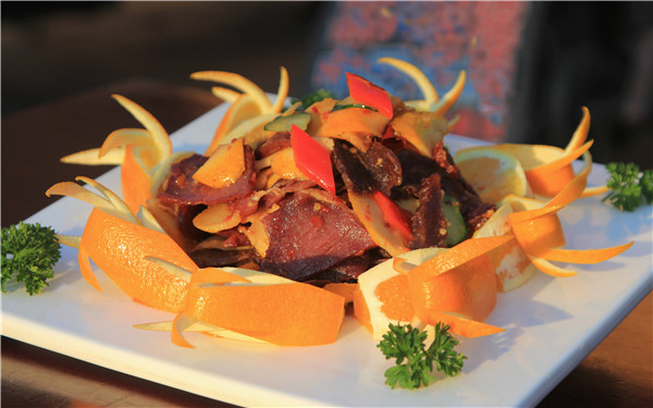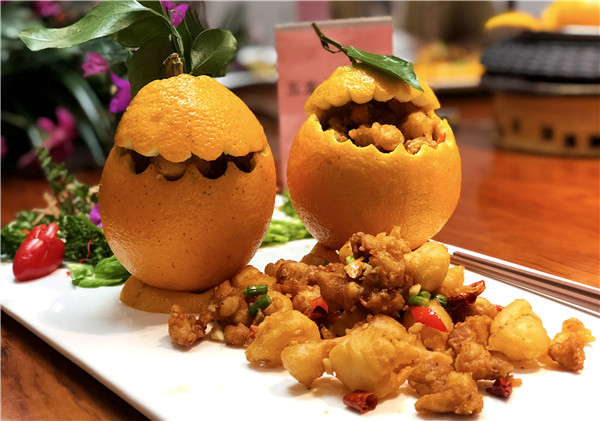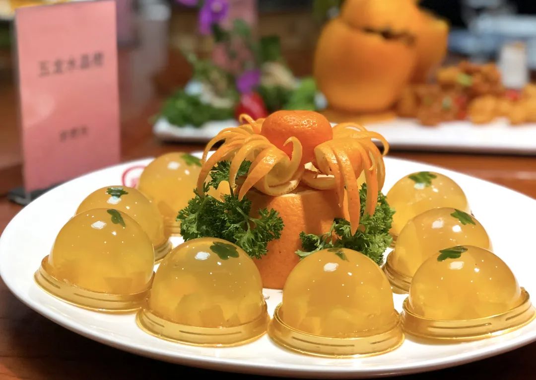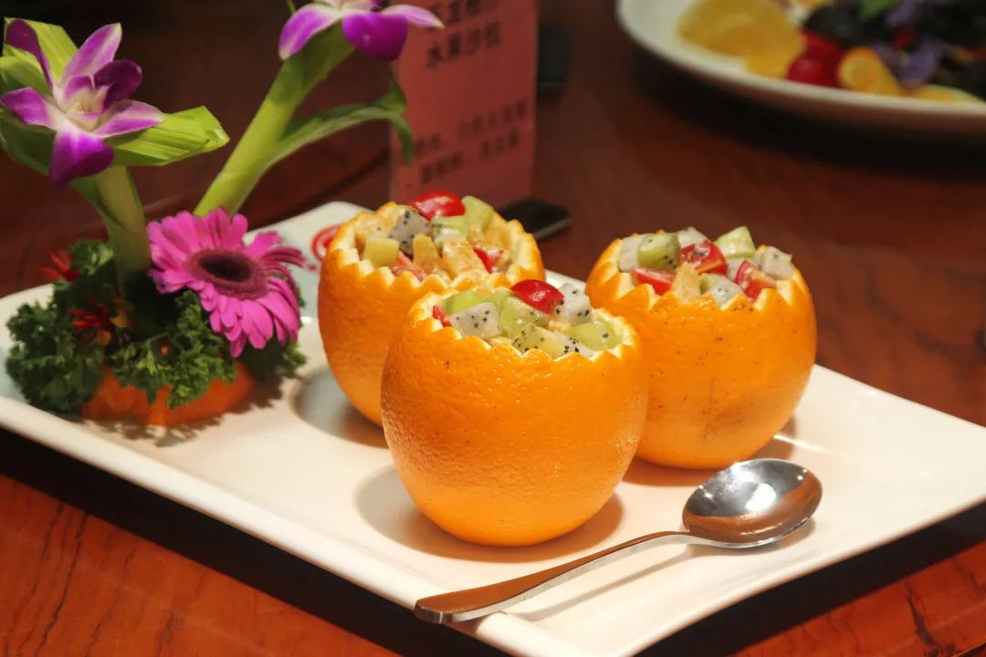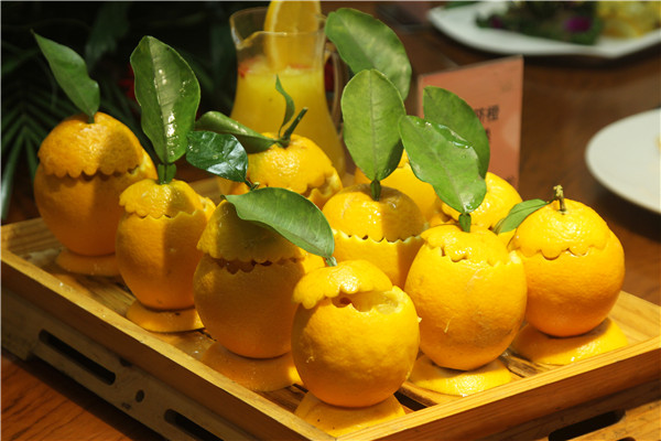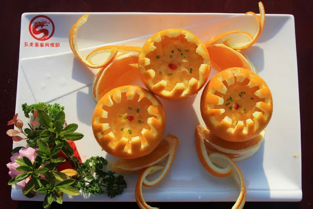 五龙脐橙宴,主料是以新鲜赣南脐橙为主,讲究鲜嫩、色泽鲜亮,以炒、煎、炸、烩、焖、蒸等多种方法制作而成。注重色香味型艺养的烹饪方法,具有突出主料、保留原汁原味、造型古朴、乡土风貌明显的特点,赢得了广大食客的高度好评和喜爱。