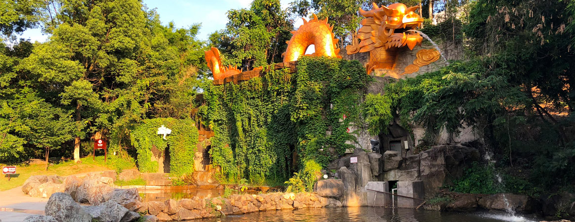 金龙漱玉瀑布,内有水帘洞,“风情园福地,水帘洞洞天”,大家可以到客家福地里面去参观感受。瀑布的水流向月亮湖,源源不断,川流不息,为人们带来福水财源。瀑布前面的圆形球,叫风水球,“风水球”正对着大门,据说这个球有个神奇的魔力,摸了它会带来好运。老人摸了建康长寿,小孩摸了聪明活泼。