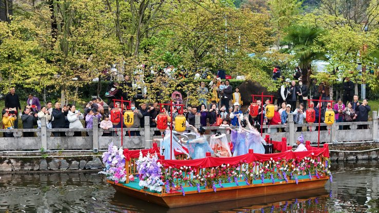 “宋韵美学”水上国潮演艺在五龙湖惊艳亮相。以湖为台、以景为戏,宋式服饰的典雅、古典舞蹈的柔美、客家民乐的悠远与水光潋滟的湖面交相辉映。一步一景、一景一戏,成为了本次活动火爆的打卡点之一。