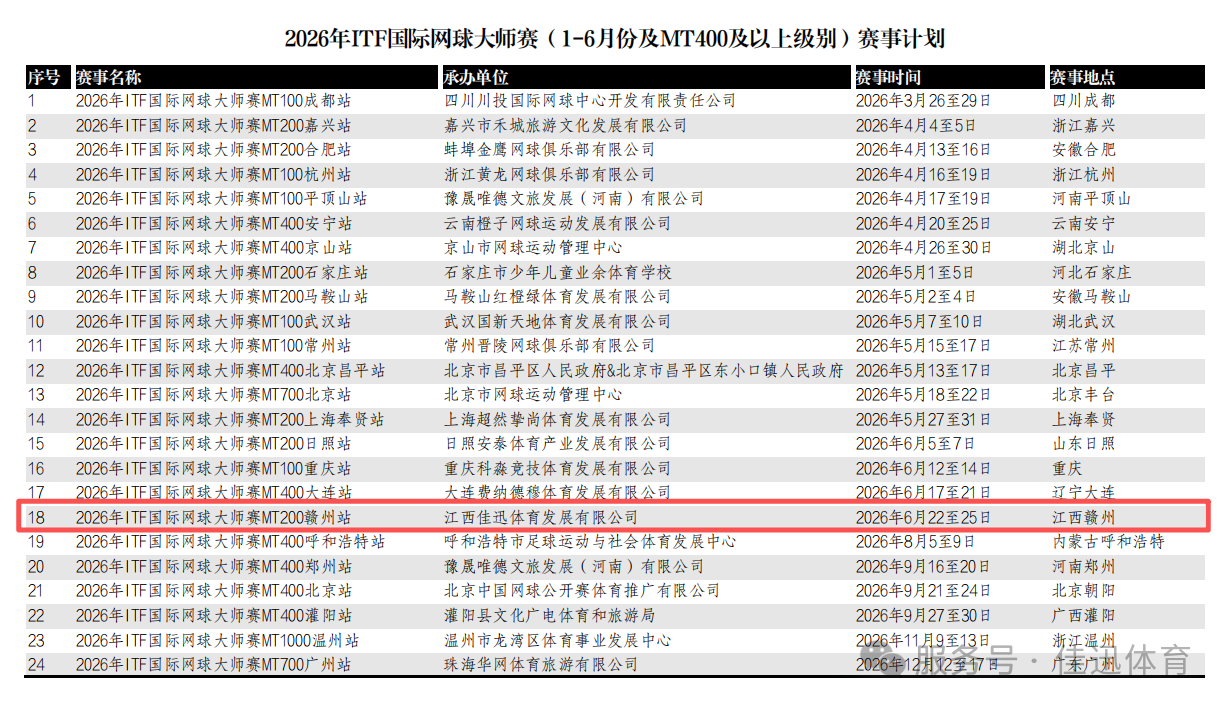 近期中国网球协会官方公告关于2026年ITF国际网球大师赛的赛事计划已公布,江西赣州将于2026年6月22日-25日举办ITF国际网球大师赛MT200赛事!